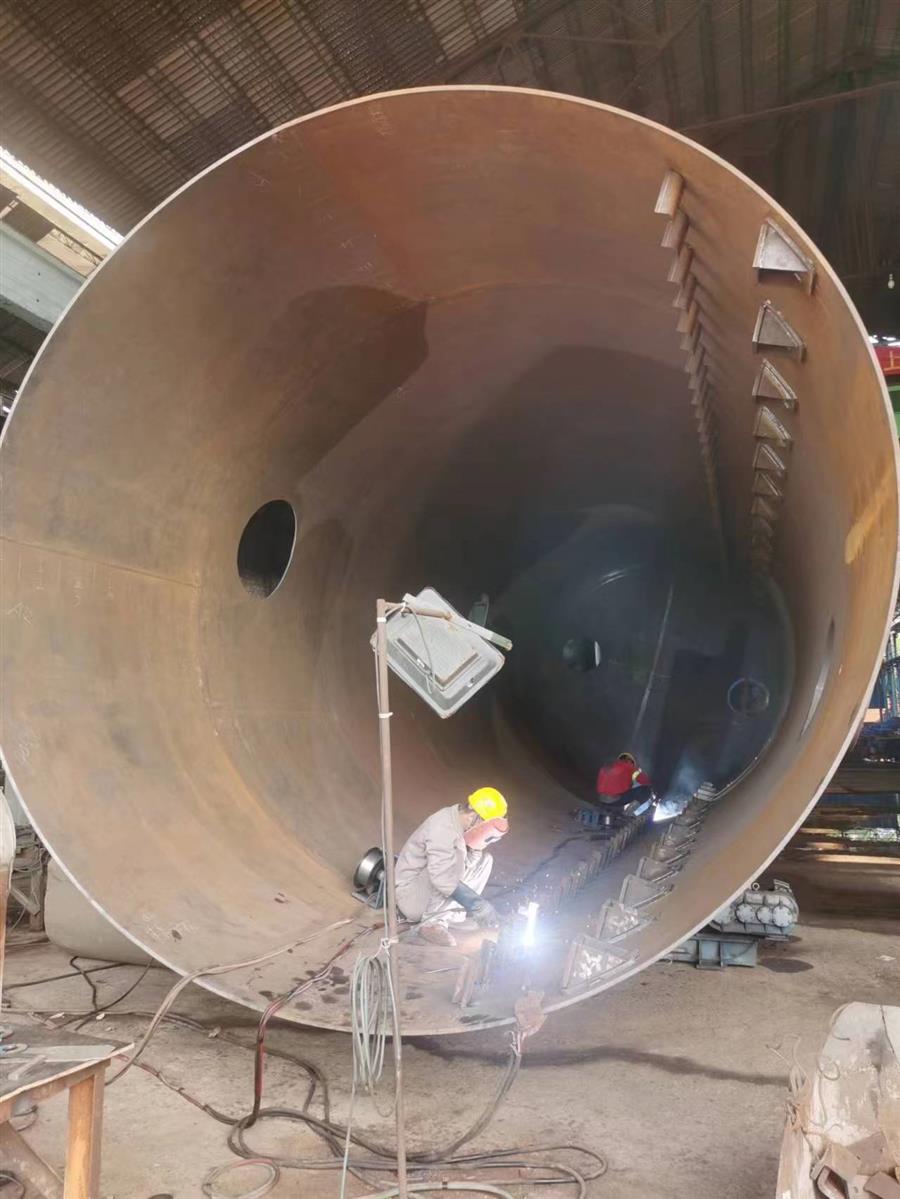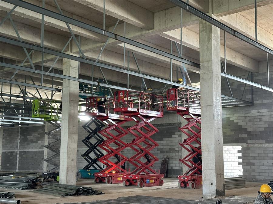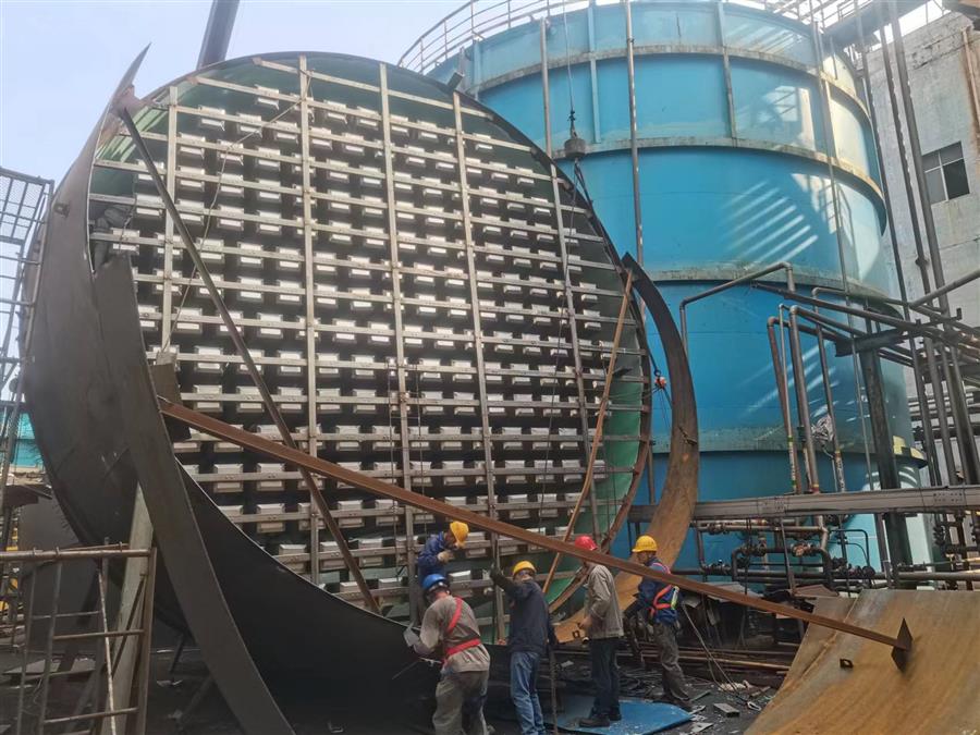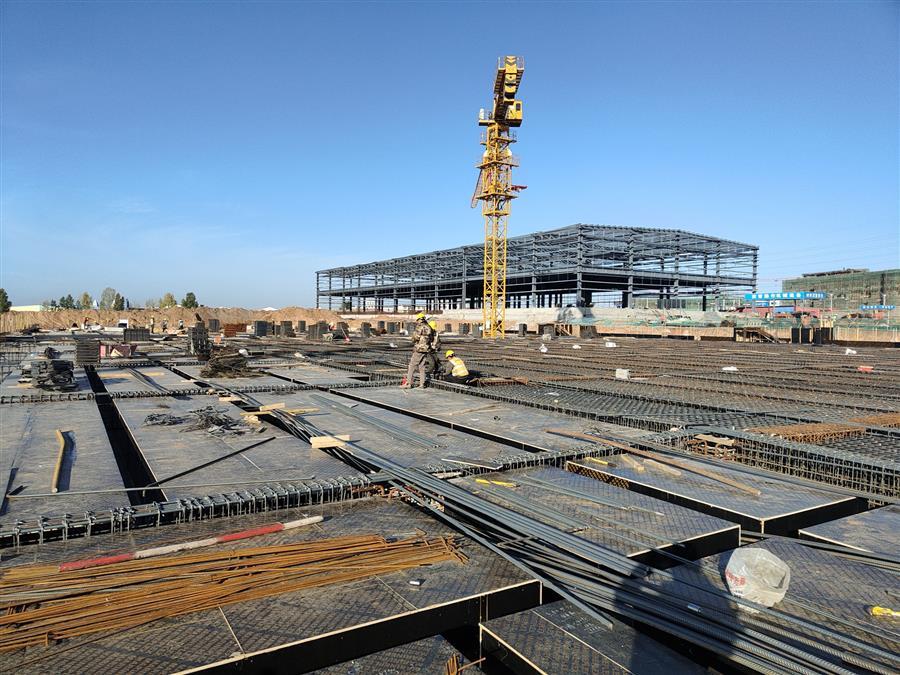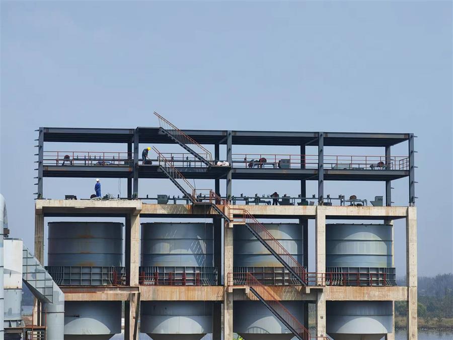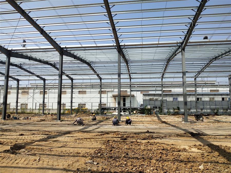 柳鋼環(huán)保公司鋼渣廠中間料場棚化項(xiàng)目之主體工程,工人正在加班開展工作。