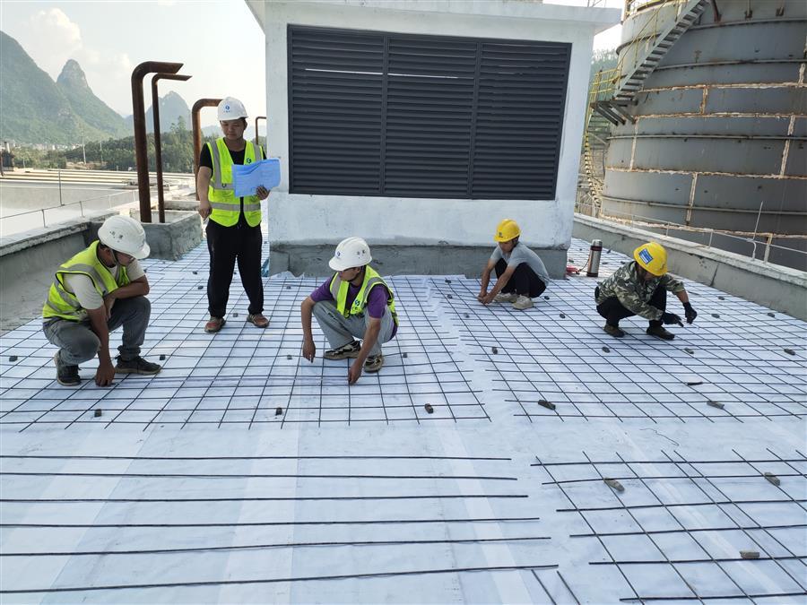 融安縣生活垃圾焚燒發(fā)電項(xiàng)目工程總承包項(xiàng)目,工人正在進(jìn)行汽機(jī)間屋面鋼筋網(wǎng)綁扎。