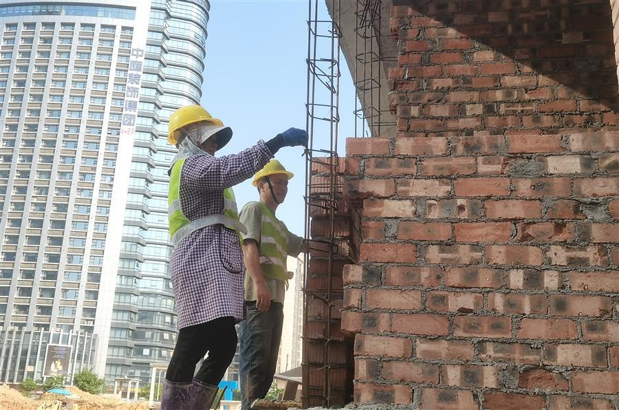 桂中大道東區(qū)地下停車場項(xiàng)目,工人在砌筑墻體。