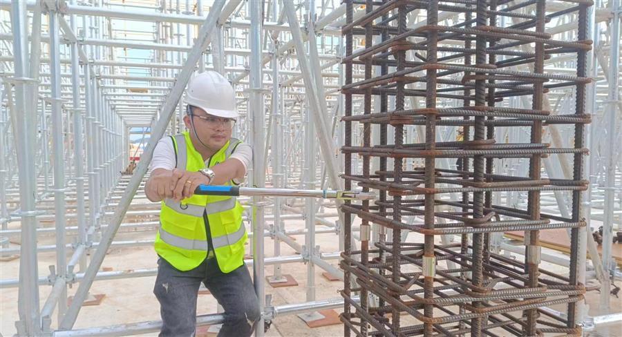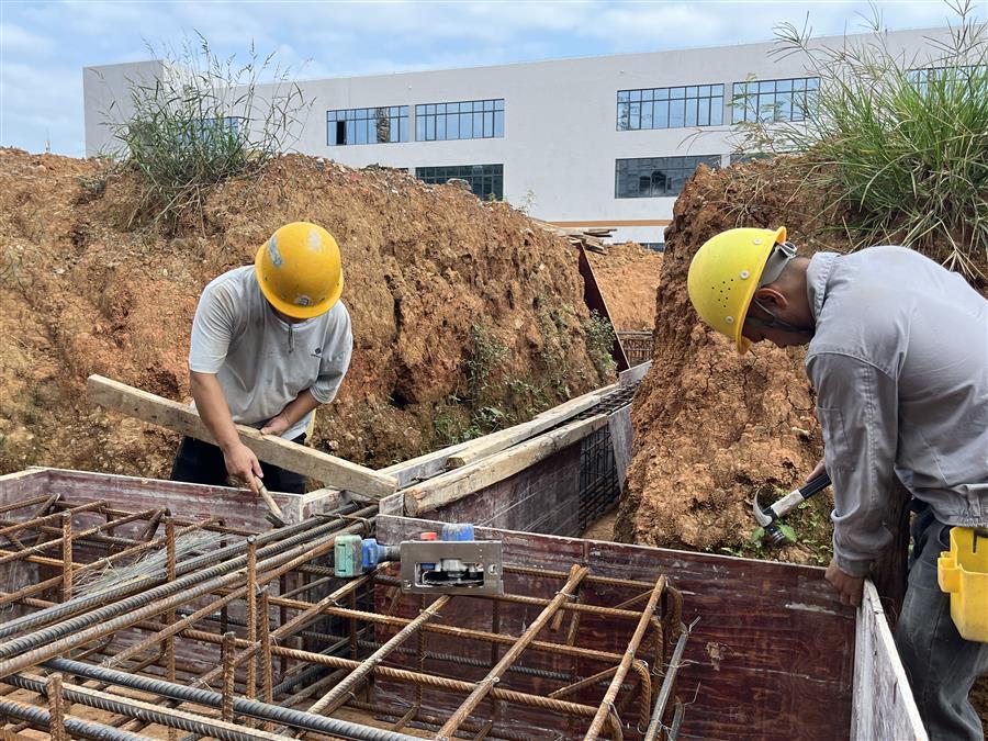 鹿寨智慧林業(yè)零碳循環(huán)產(chǎn)業(yè)園項(xiàng)目,管理人員正在進(jìn)行鋼筋套筒扭矩測試。
