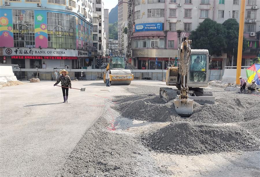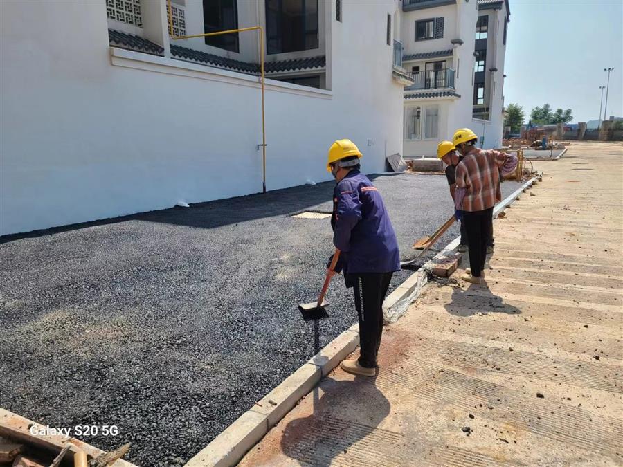 鹿寨縣城南新區(qū)城中村改造項(xiàng)目設(shè)計(jì)-采購-施工(EPC)總承包項(xiàng)目,工人正在對室外道路鋪設(shè)瀝青。