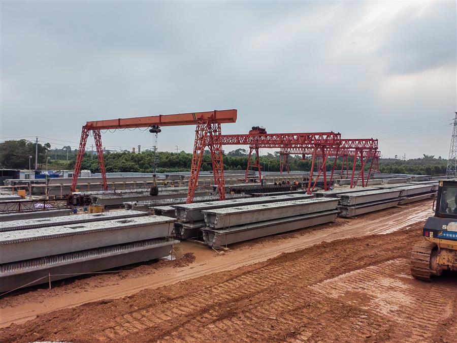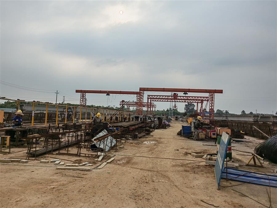 在施工現(xiàn)場(chǎng),20多臺(tái)大型設(shè)備在不同時(shí)段連續(xù)配合作業(yè),運(yùn)輸車輛有序進(jìn)行運(yùn)土填筑路基、材料進(jìn)出場(chǎng),100多名項(xiàng)目管理人員及工人分為預(yù)制梁場(chǎng)、樁基施工、橋梁下部結(jié)構(gòu)等班組全線鋪開,在各個(gè)作業(yè)點(diǎn)上有條不紊地開展施工作業(yè)。
