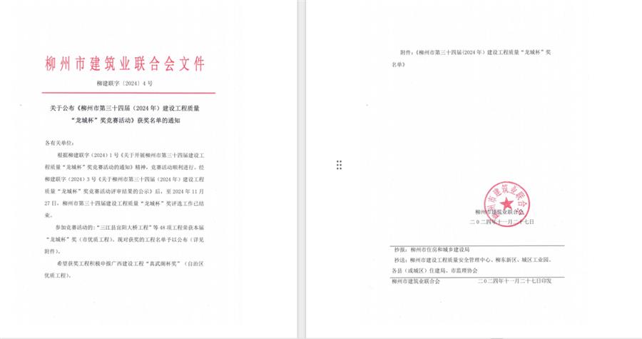 11月28日,柳州市建筑業(yè)聯(lián)合會公布柳州市第三十四屆(2024年)建設(shè)工程質(zhì)量“龍城杯獎”競賽活動獲獎名單和2024年柳州市建設(shè)工程優(yōu)質(zhì)結(jié)構(gòu)獎名單,由冶建公司承建的三江縣宜陽大橋工程等4項工程榮獲“龍城杯”獎;柳州市柳東新區(qū)明德小學(xué)項目(一期)等2項工程獲柳州市“優(yōu)質(zhì)結(jié)構(gòu)獎”。