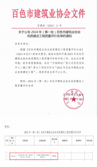 近日,百色市建筑業(yè)協(xié)會(huì)公布表彰決定,由冶建公司桂鴻分公司承建的田東縣濱江大道一期項(xiàng)目(K2+780~K4+864)獲評(píng)為“2024 年百色市建筑業(yè)協(xié)會(huì)優(yōu)質(zhì)建設(shè)工程”。