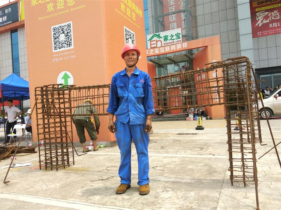 8月31日,在柳州家居建材博覽中心室外廣場(chǎng)上,一群頭戴安全,身著工裝的農(nóng)民工在各自忙碌著,不時(shí)傳來“叮叮?!变摻钆鲎猜暋ⅰ皣W嘩嘩”刨木聲、“咚咚咚”敲磚聲……伴隨著一片熱鬧的聲響,柳州市第四屆農(nóng)民工技能大賽暨柳州市第三屆農(nóng)民工家庭服務(wù)業(yè)大賽火熱舉行。