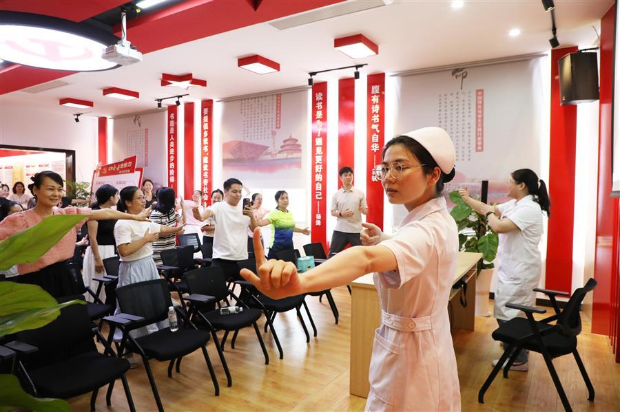 隨后,蔣芳幸醫(yī)生現(xiàn)場示范八段錦經(jīng)典動作,逐一講解要領(lǐng)及養(yǎng)生功效。職工們跟隨練習,在醫(yī)生指導下逐漸掌握動作規(guī)范,切身感受傳統(tǒng)功法的養(yǎng)生魅力。